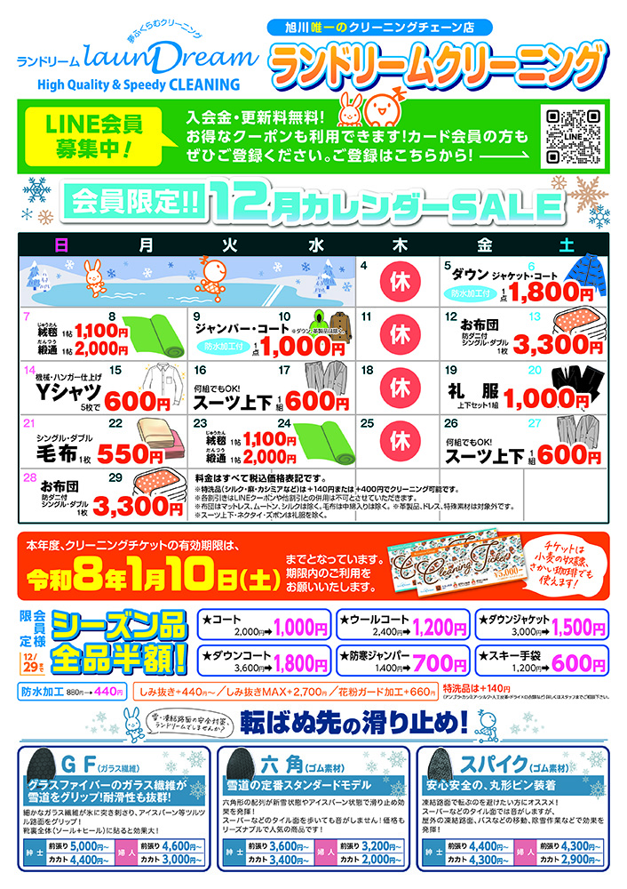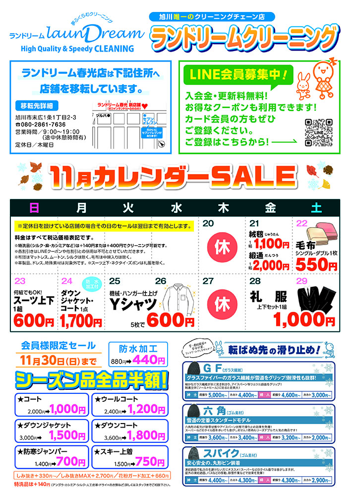 ※防寒、染み抜き、布団など特殊品は除きます。ご不明点等ございましたら、店舗またはホームページよりお問い合わせください。